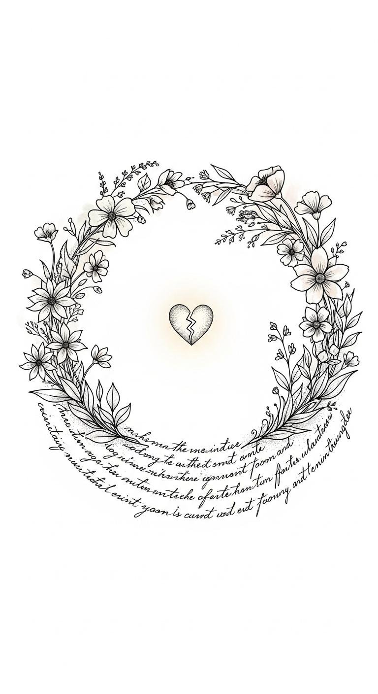 The design combines organic imperfection with tender symbolism: wildflowers and vines represent growth and uniqueness, the cracked glowing heart signifies resilience and inner light despite fractures, and the faded script anchors the piece with the original affirmation, integrating words as part of the skin’s story.