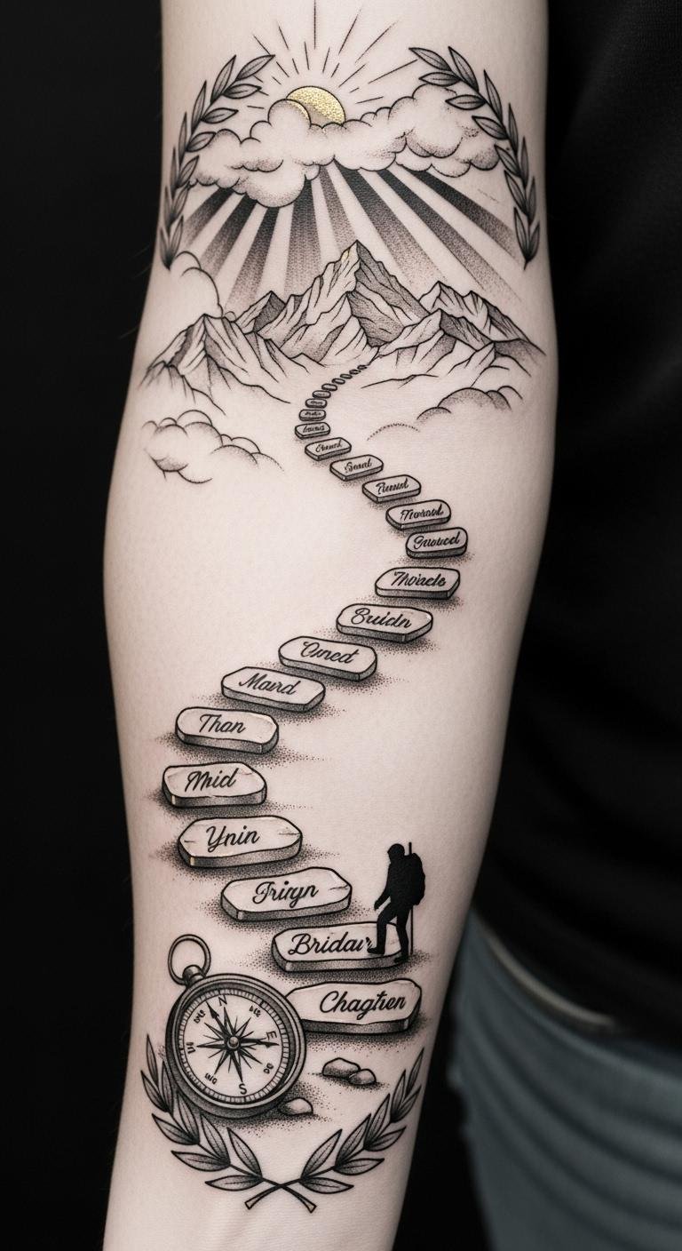 The fine-line, monochrome style keeps it elegant and timeless, with gold accents to highlight key words and the climber’s next step—suitable for a forearm placement where the path can wrap slightly and be visible during movement, reinforcing motivation in daily life.