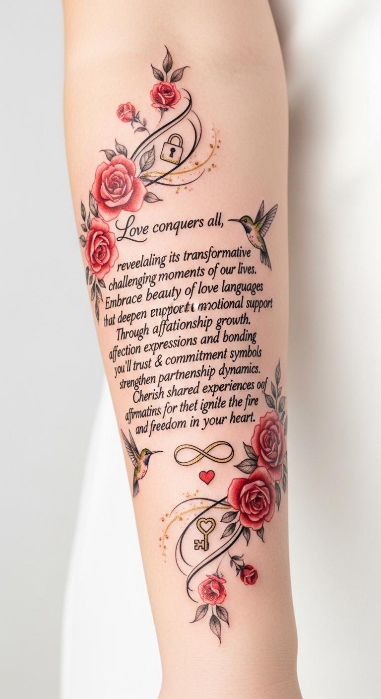 The entwined script and accompanying imagery symbolize enduring affection and the many ways love sustains and transforms; roses and hummingbirds express passion, delicacy, and joyful energy while the infinity and lock-and-key icons denote trust, commitment, and freedom found within partnership.