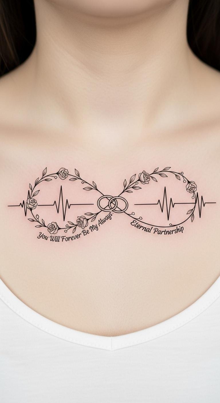 The entwined vines and heartbeat line symbolize enduring life and continuity, while the roses and interlocking rings represent love, passion, and commitment; the fine single-needle style conveys intimacy and timelessness.