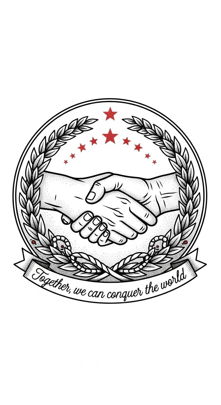 The clasped hands at the center symbolize partnership and mutual support; the laurel wreath represents victory earned together, and the interwoven ropes signify unbreakable bonds.