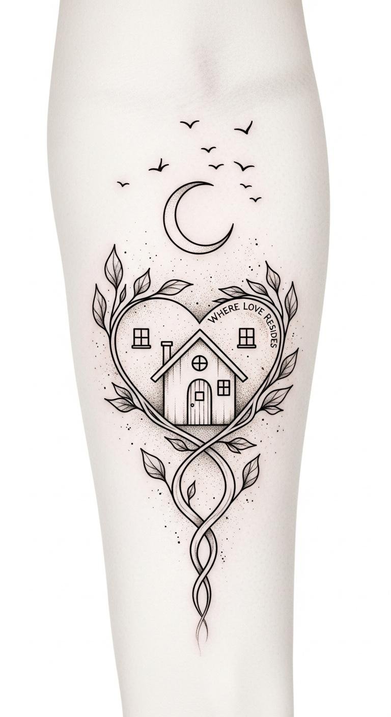 A small, intimate tattoo that blends the literal and metaphorical: the heart-shaped cottage symbolizes home and emotional sanctuary, the interlocking vines represent mutual growth and commitment, and the crescent moon and birds hint at peace, protection, and freedom within the bond.