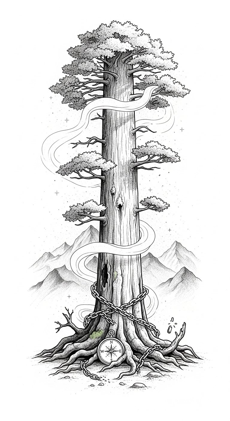 This design channels the text’s themes directly into imagery: a stabilizing redwood trunk and roots symbolizing resilience and grounding, with delicate needles and ferns to evoke connection to nature.