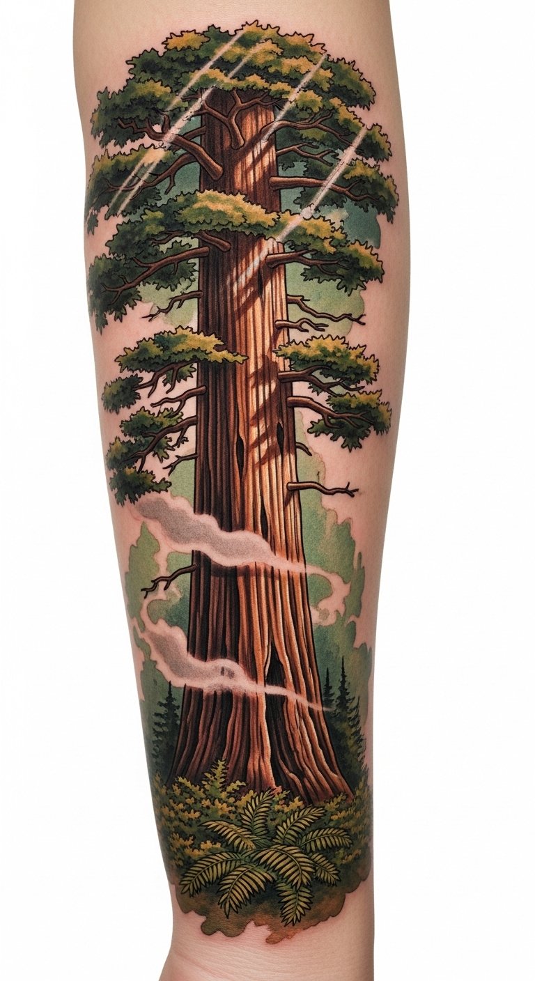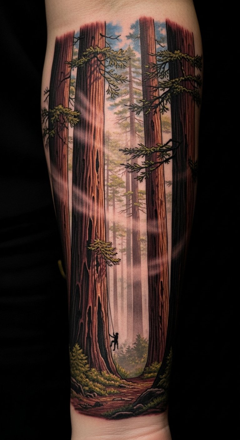 Designed for a forearm or upper back placement, this tattoo concept uses a vertical composition of towering redwoods rendered in hyper-realistic black and gray with selective warm highlights to emphasize sunlit bark ridges.