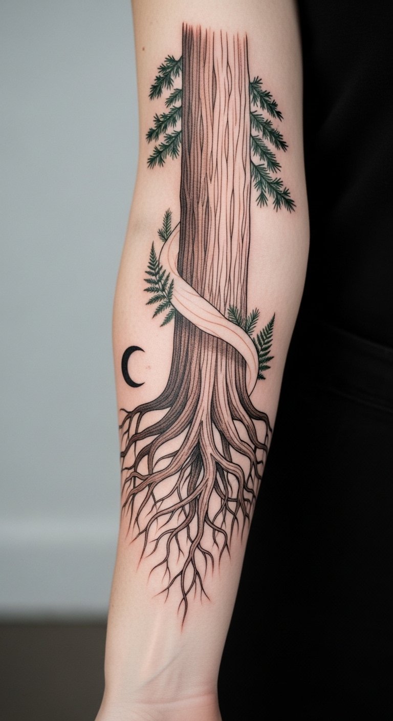 The warm sepia and deep greens convey earthiness and belonging, while the negative-space crescent moon introduces quiet freedom. Emotionally it offers calm strength and constancy; placed along the forearm or calf it follows natural lines of the body, allowing the roots to wrap and the trunk to rise, reminding the wearer to stay true to their path.