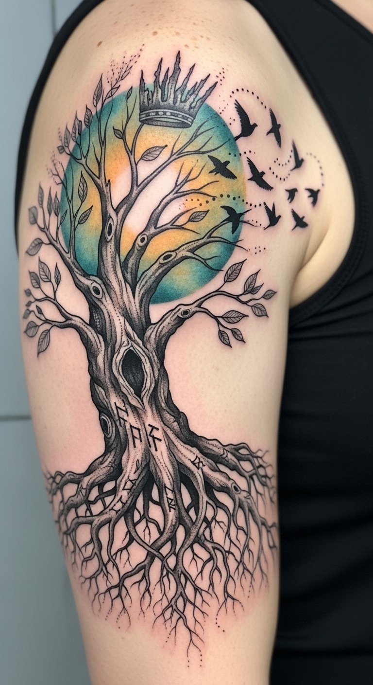 This design emphasizes those meanings: the exposed roots represent foundation and ancestry, the rune-like patterns hint at heritage, and the birds express liberation and transformation; emotionally it evokes groundedness moving toward hope.