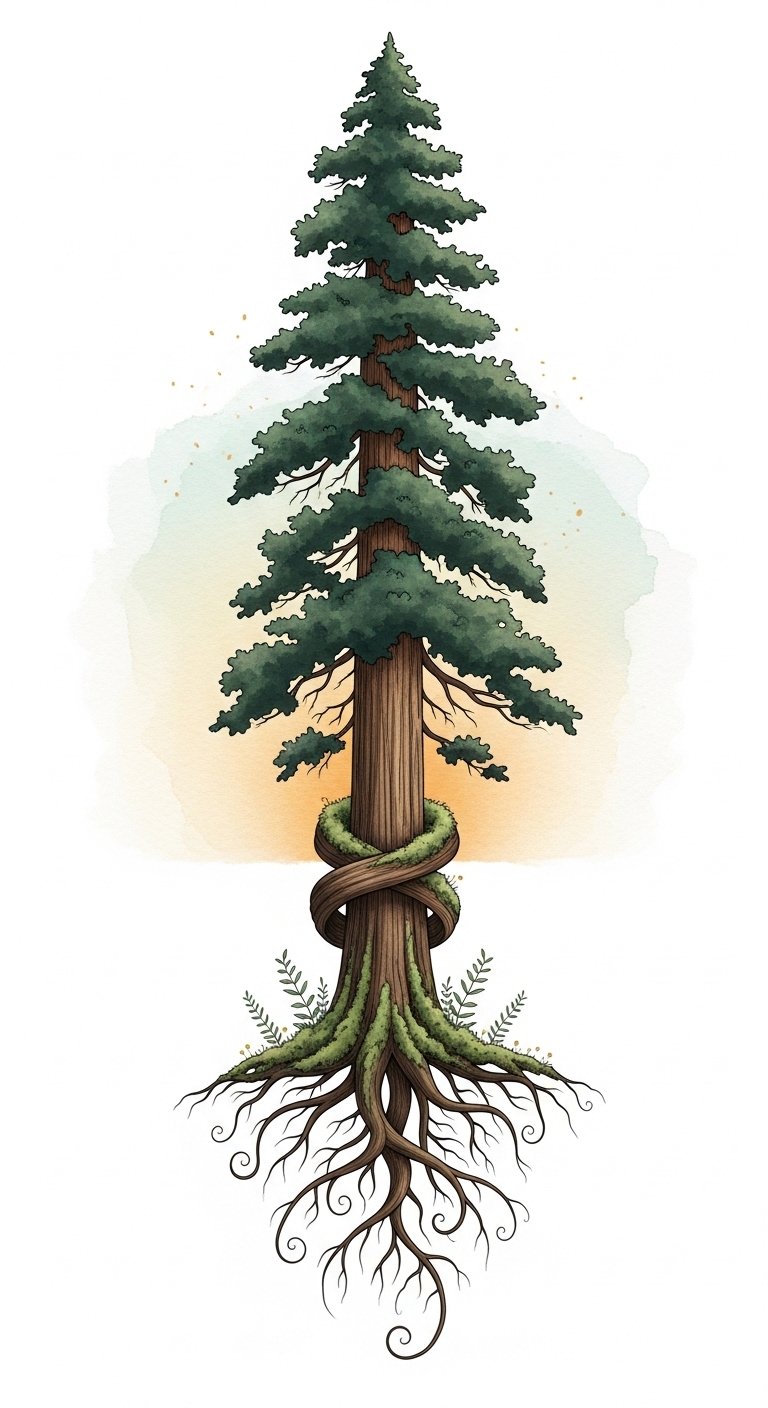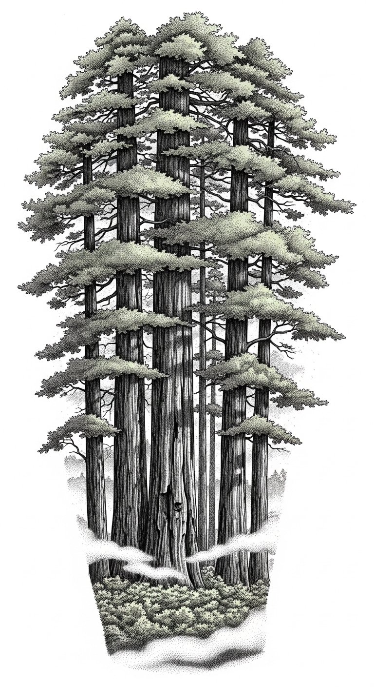 This design concept centers on a single, towering redwood rendered in fine-line and subtle dotwork to emphasize bark texture and needle-like foliage, evoking stoic strength and quiet endurance; placed along the inner forearm or down the ribcage, it follows the body’s natural vertical line to suggest growth and upward-reaching resilience, while a faint watercolor wash behind the trunk adds emotional warmth and a feeling of deep-rooted connection to nature, making it both a personal emblem of stability and a contemplative piece that invites reflection.
