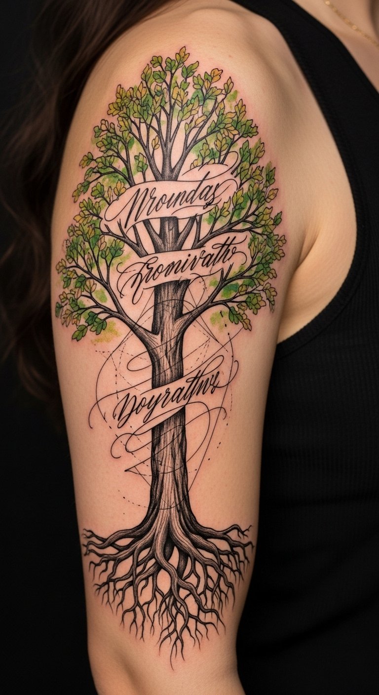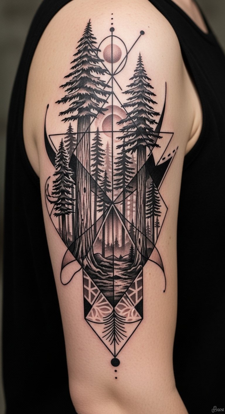 Ideal placements are the outer upper arm, ribcage, or calf where the tree’s verticality complements the body’s contours; the geometric elements help the tattoo read well from a distance and allow easy adaptation to different sizes.