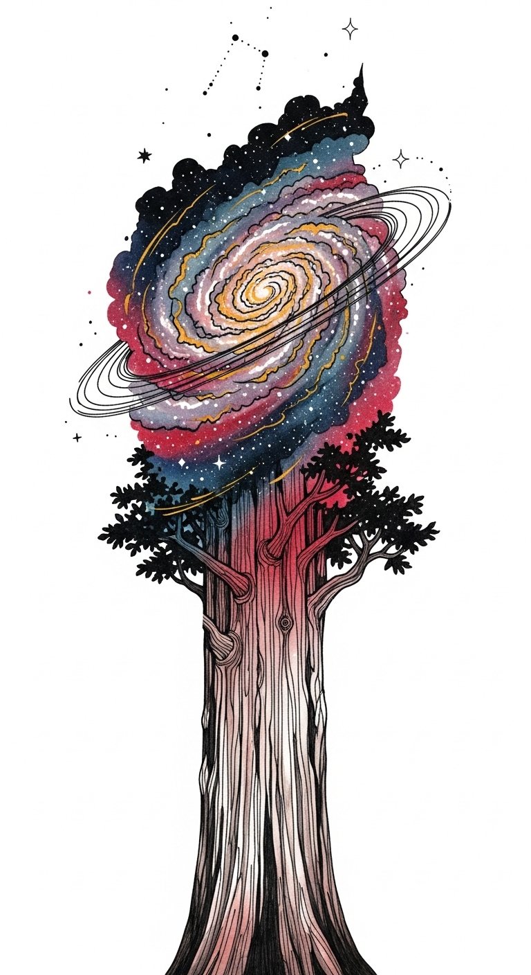 Through vivid imagery and thoughtful symbolism, you can express your passion for the environment, inspiring others to appreciate and protect the natural world that nourishes our freedom. This placement allows the tall, vertical form to mirror the tree’s towering presence; the textured bark and roots symbolize resilience and interconnectedness, the bird and stars evoke freedom and guidance, and the watercolor background conveys the living atmosphere of the forest, creating an emotional reminder of stewardship when revealed or concealed.