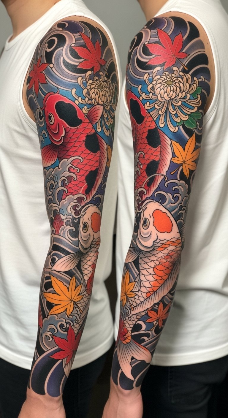 Ideal placement is a full arm sleeve wrapping from shoulder to wrist, using the arm’s curvature to emphasize flow; consider extending onto the chest or back for larger compositions, and place the brightest colors toward focal points (shoulder and forearm) while keeping negative space to let the skin breathe and enhance contrast.
