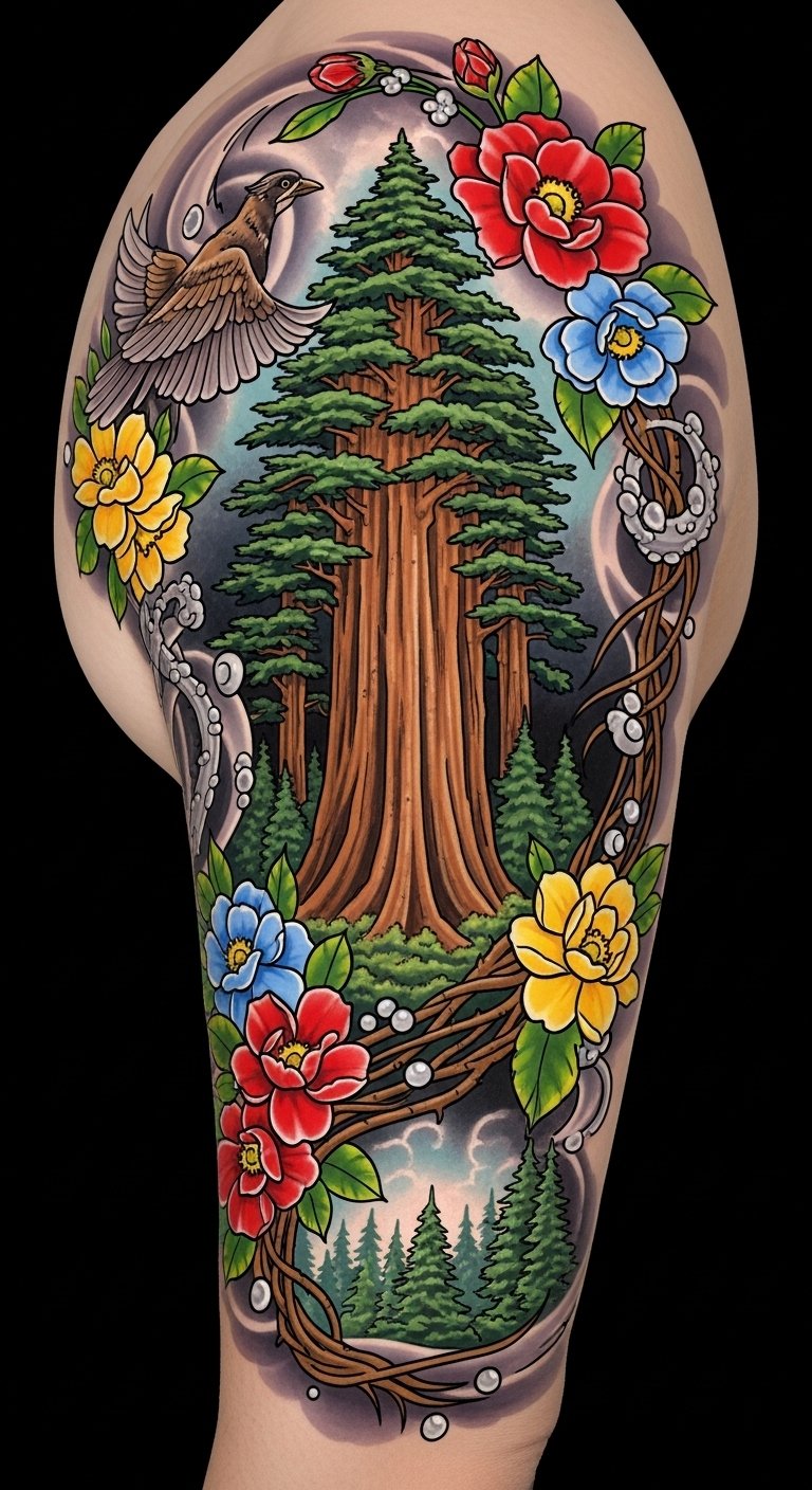This design concept weaves vivid blooms and towering redwood silhouettes into a flowing composition that travels with the body’s contours—ideal for a sleeve, back piece, or side panel—symbolizing growth, resilience, and personal freedom; the flowers represent individual moments of joy and renewal, the redwoods embody strength and rootedness, and their intertwining evokes an emotional balance between reaching outward and staying grounded.