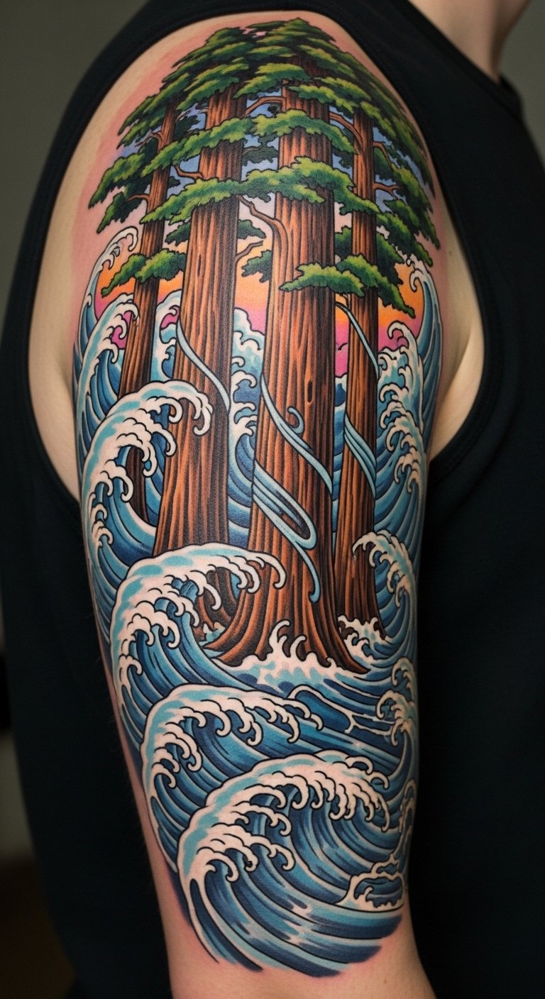 This design blends the solidity of redwood trunks with dynamic ocean waves to symbolize balance between strength and fluidity; emotionally it evokes calm confidence and a yearning for exploration. Ideal placements include a sweeping upper arm or full back where the verticality of the trees and the flowing wave motion can wrap naturally around musculature, allowing fine line detail in the bark and soft shading in the water to create depth and movement.