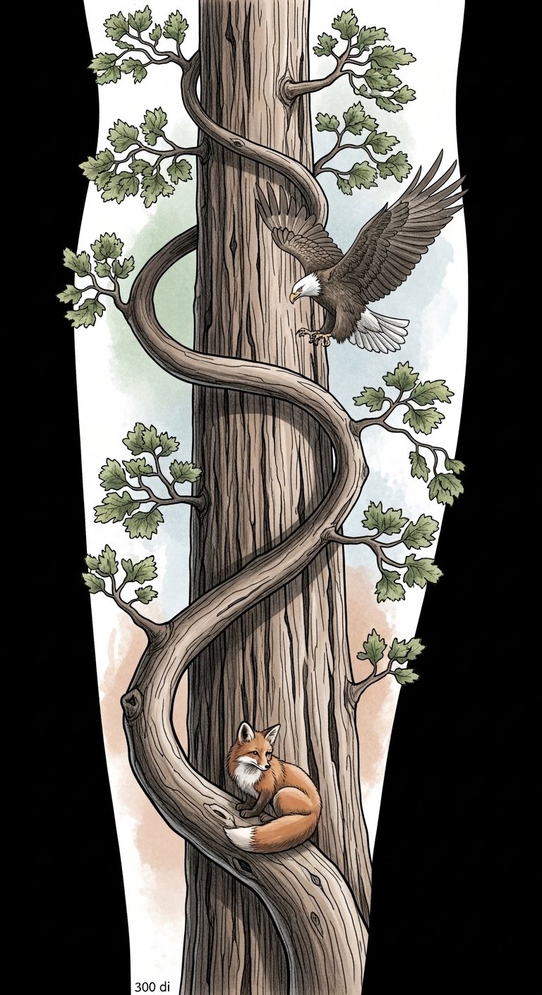 Place along the forearm or calf to follow the limb’s length, evoking upward growth and movement; emotionally it conveys endurance, freedom, and gentle companionship, with the eagle bringing aspiration and the fox inviting curiosity and adaptability.