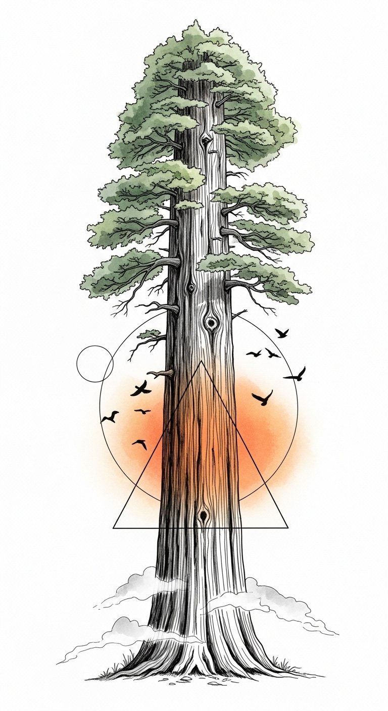 The design symbolizes longevity, resilience, and rooted strength (redwood) balanced with personal freedom (birds) and harmony (geometric frame). Watercolor washes add emotional warmth and a dreamlike quality, while fine-line bark detail grounds the piece in realism.