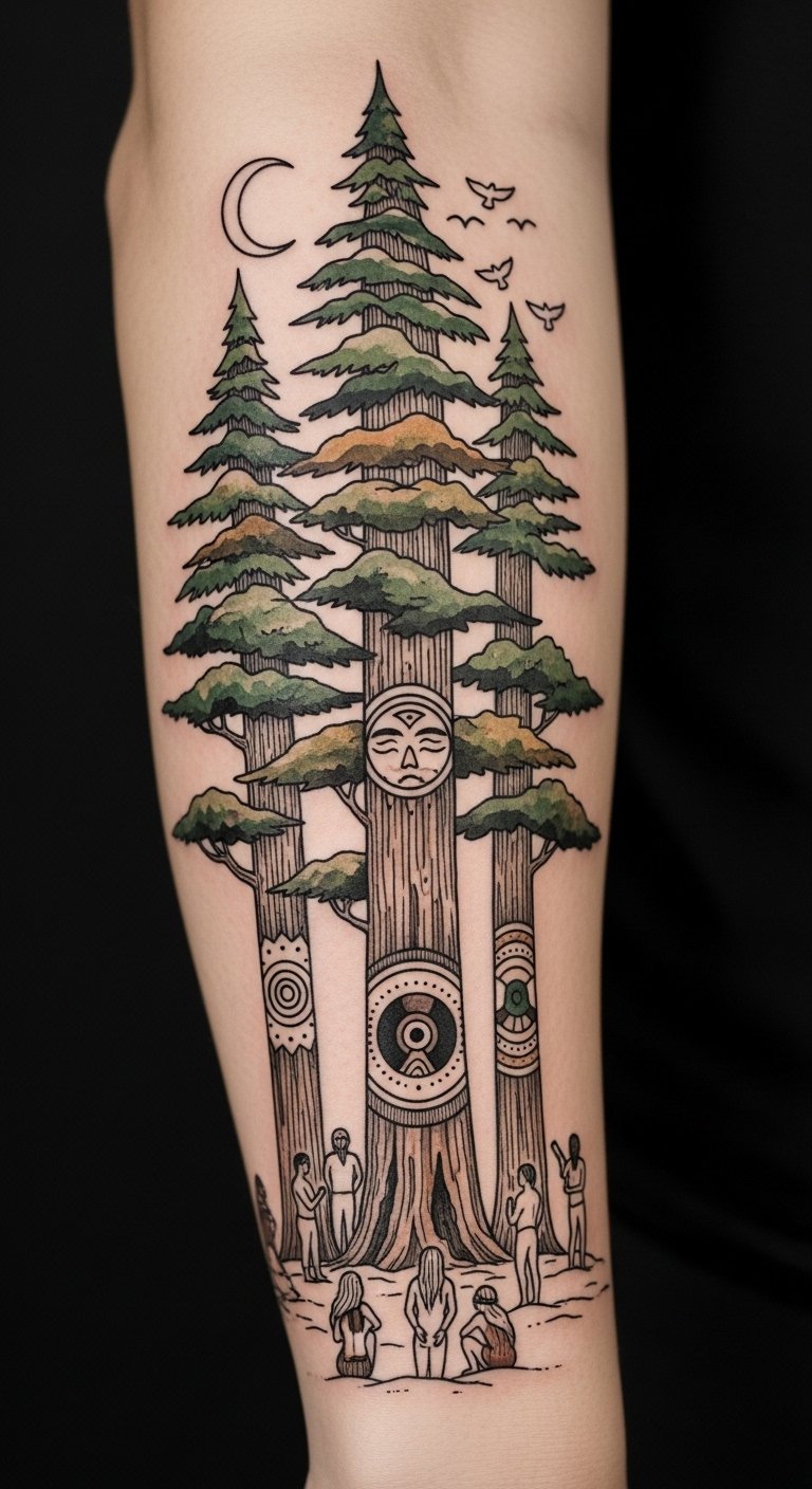 Ideal placement is vertical: forearm, ribcage, or along the spine to emphasize height and allow detailed storytelling; scale can be minimized for discreet personal meaning or expanded for a bold back piece conveying collective heritage.