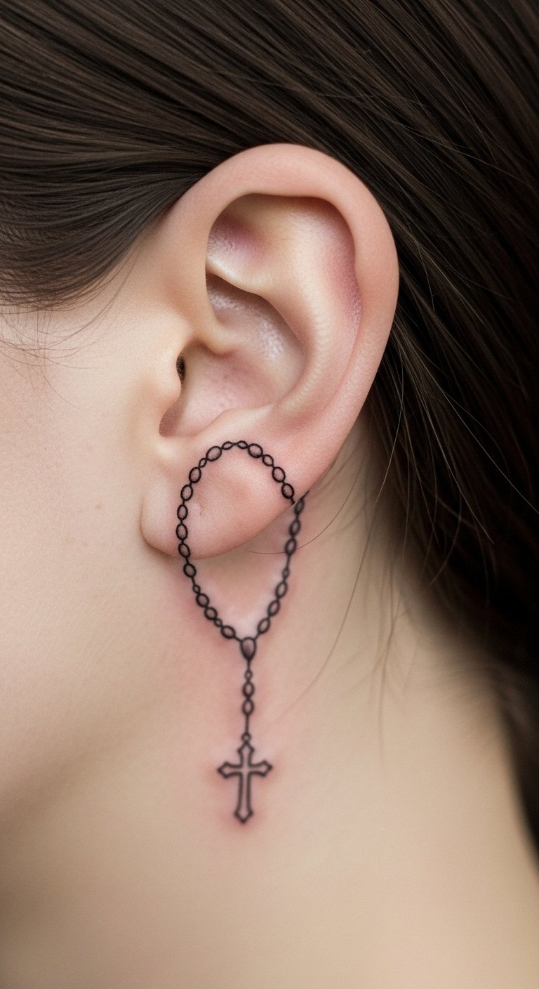 If you’re looking to express your faith in a subtle yet striking way, a minimalist rosary tattoo behind the ear could be the perfect choice for you.