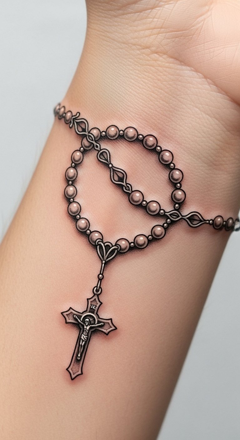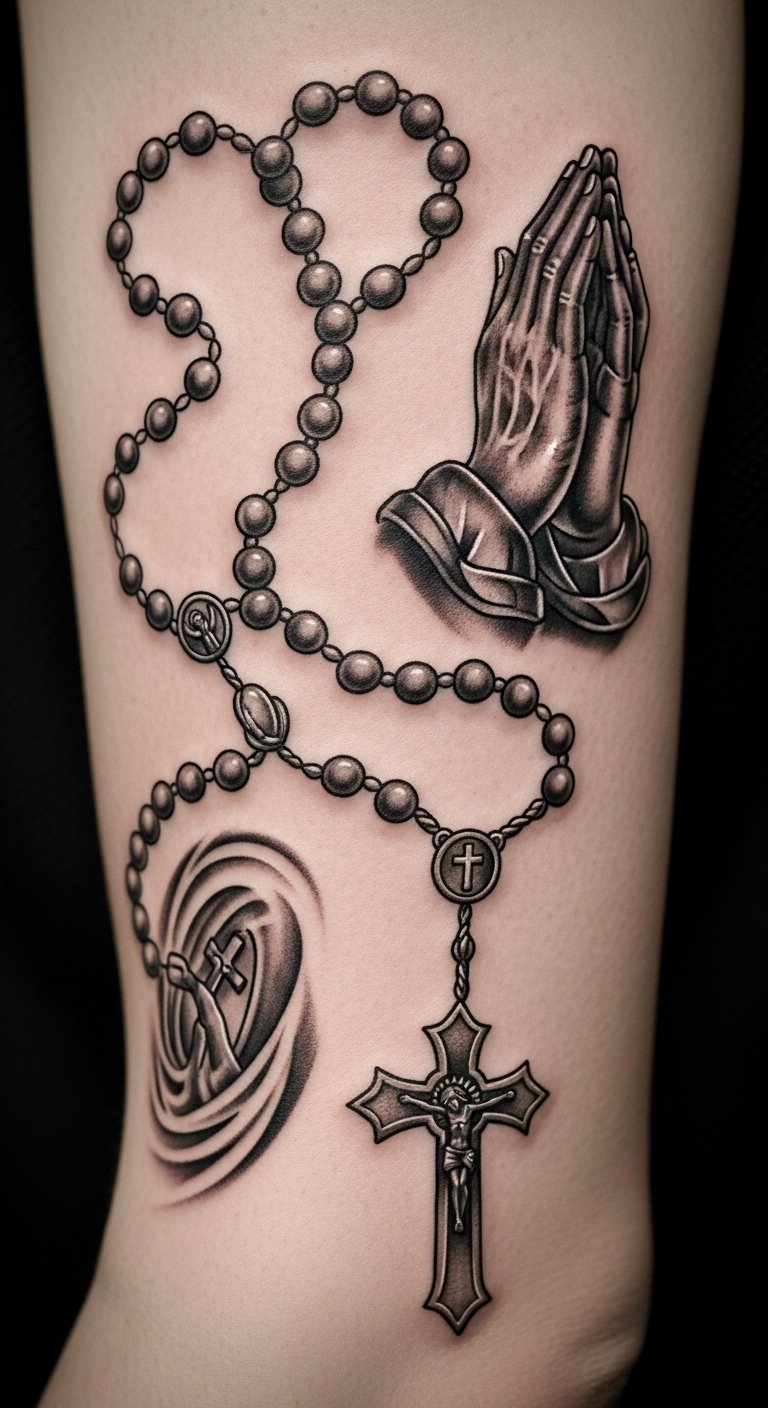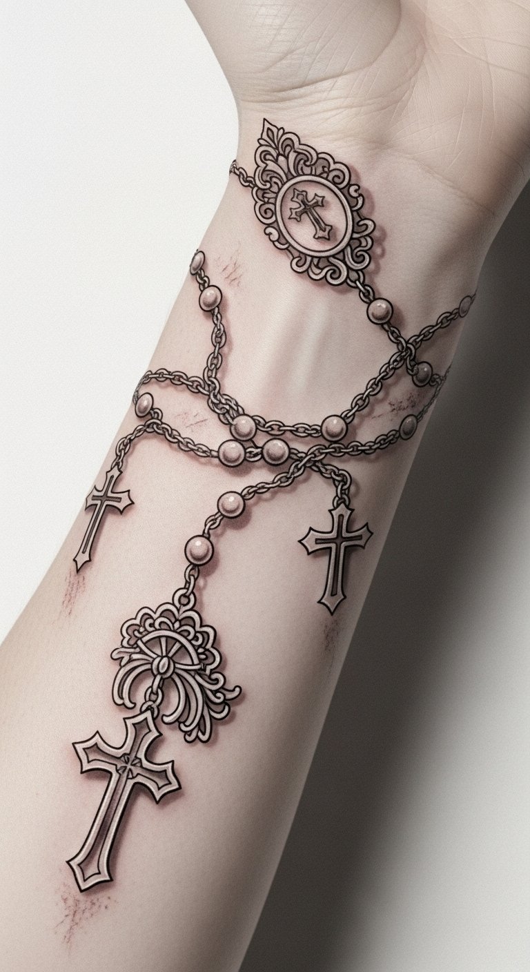 This design uses the rosary as a visual ledger of milestones—each bead marked with subtle symbols (dates, tiny glyphs, or textured finishes) to denote growth and resilience. Integrate a small cross and prayer hands near the focal bead to anchor the composition, with delicate shading to evoke quiet devotion. Emotionally it communicates a journey from struggle to liberation, a private affirmation of faith and freedom. Ideal placements include the inner forearm for visibility and daily reminder, along the ribcage for intimacy, or wrapping gently around the wrist or ankle for continuity.