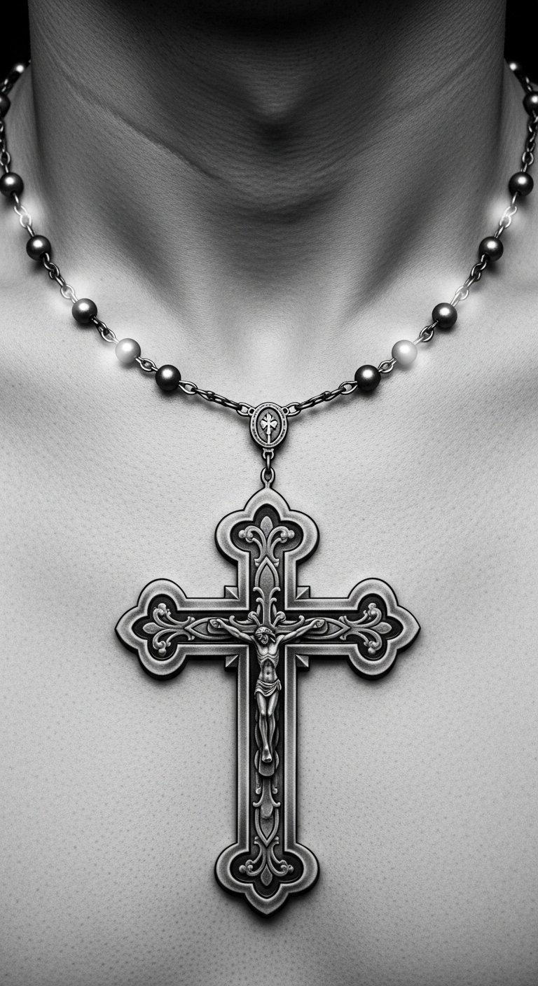 A large cross adorned with rosary beads across your chest makes a powerful statement about your faith and individuality.