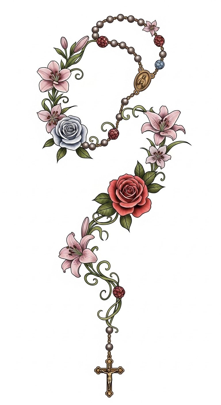 Symbolically the vines represent growth and interconnectedness, the rosary embodies faith and devotion, and the flowers suggest renewal and beauty—together evoking empowerment, peaceful resilience, and a harmonious bond between spirit and nature; placement on the arm or side allows movement to animate the concept and offers personal visibility or discreetness as desired.