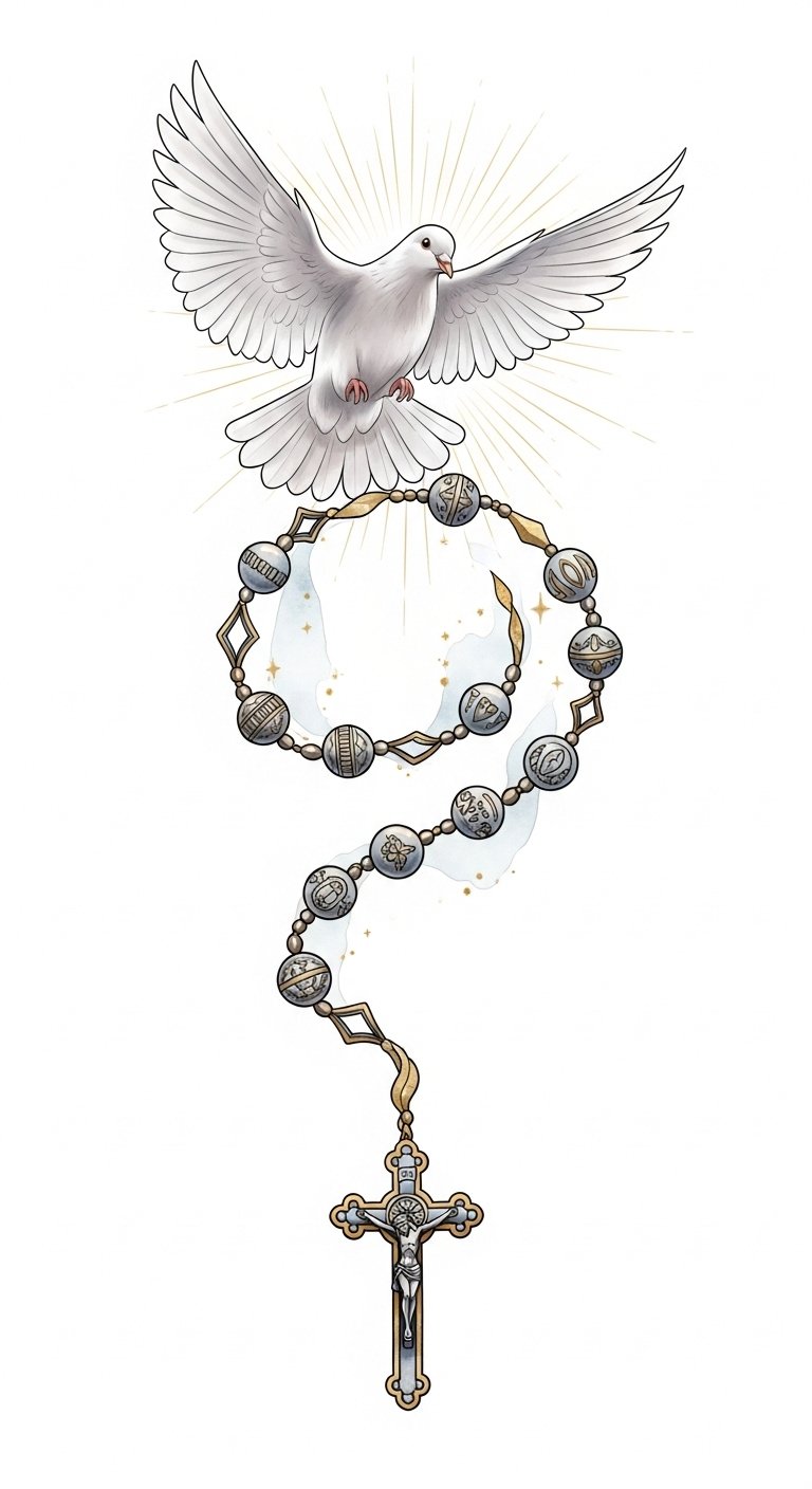 Rosary Tattoo With a Dove Symbolizing the Holy Spirit