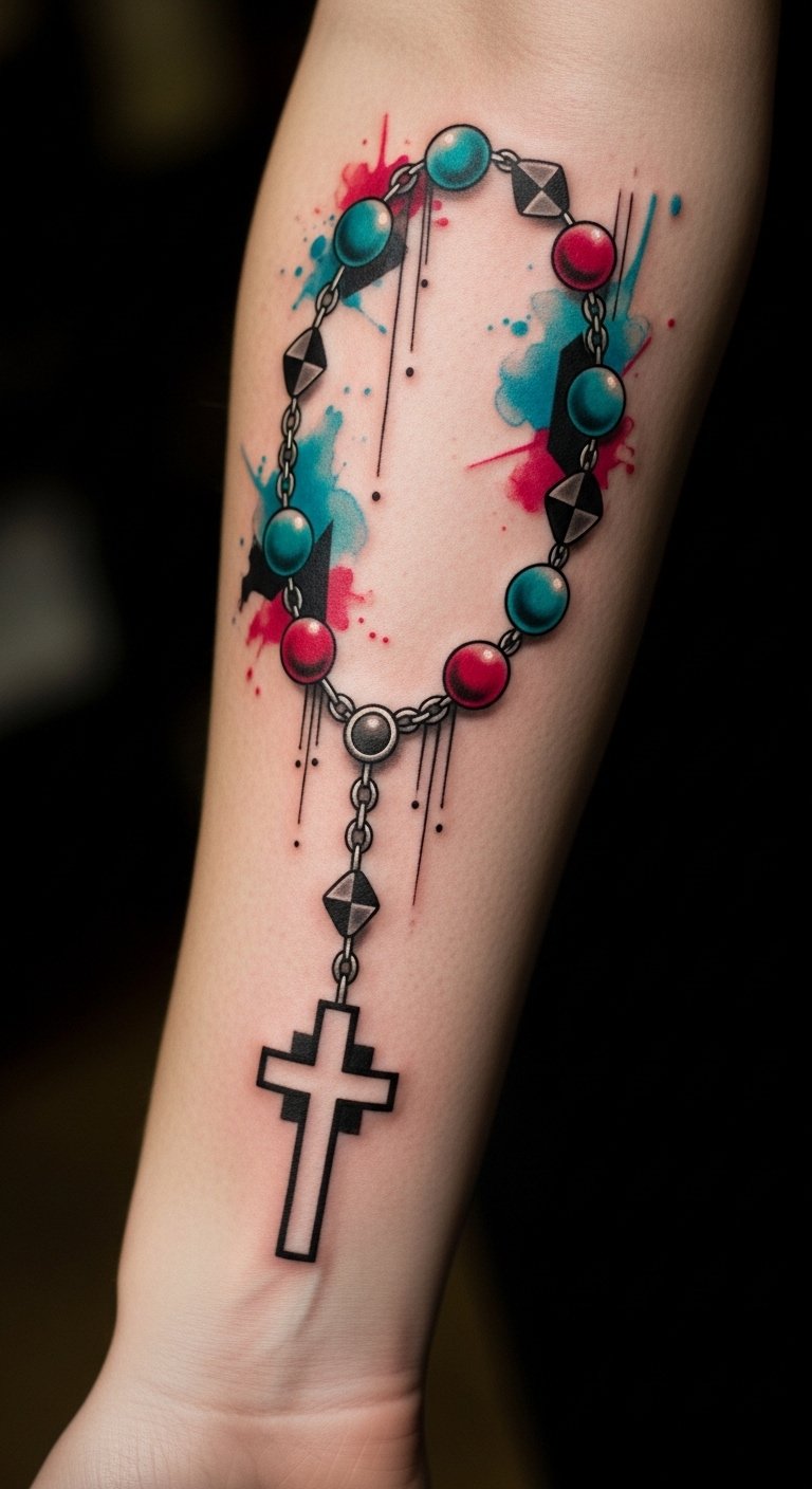 This tattoo concept uses the original text as a visual blueprint: flowing, calligraphic lines form the rosary strand, punctuated by beads rendered as bold color swirls and small geometric motifs, creating a balance between sacred form and abstract expression.