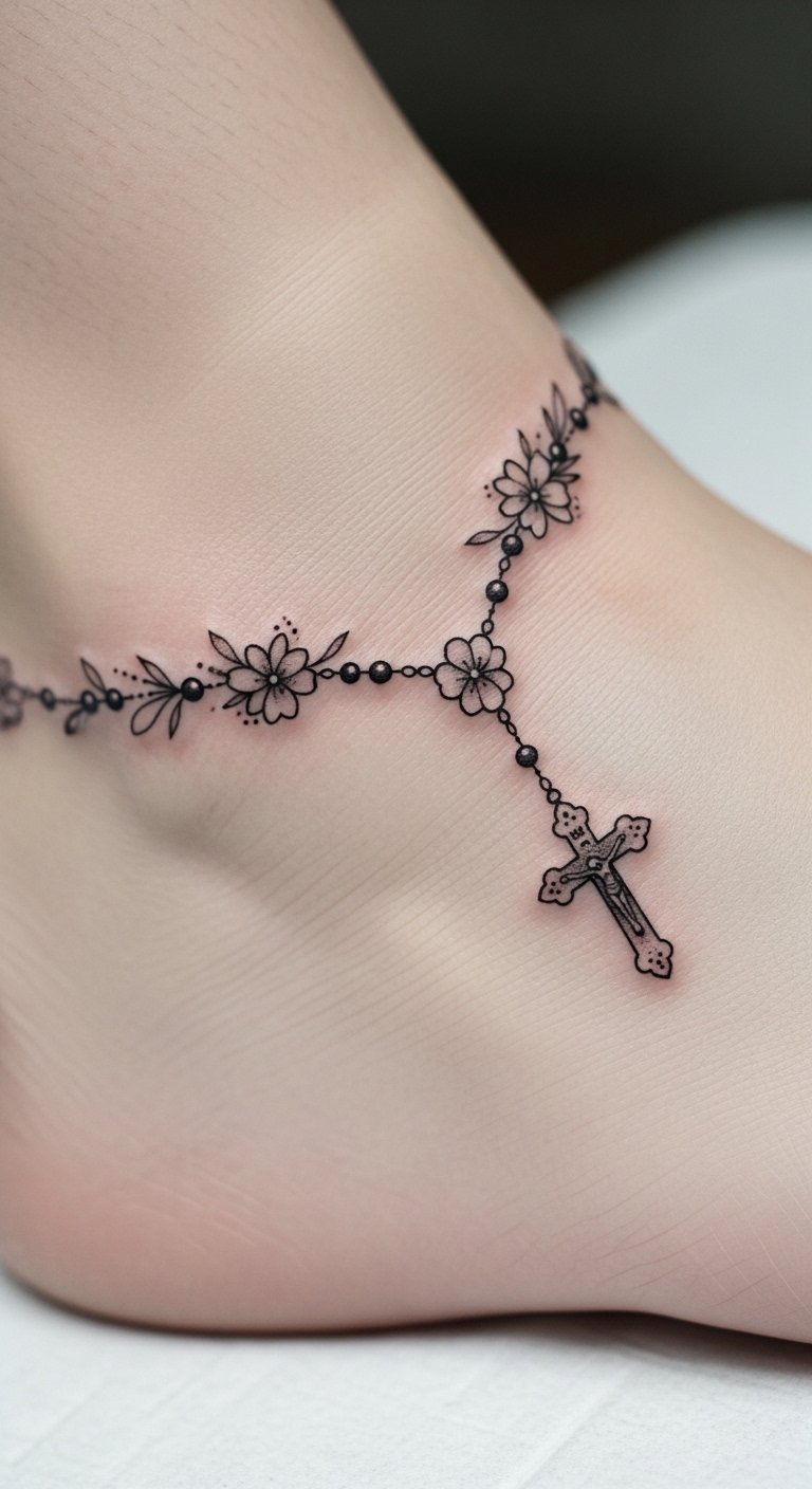 A small and subtle rosary tattoo on the ankle can be a beautifully discreet way to carry your faith with you everywhere you go.