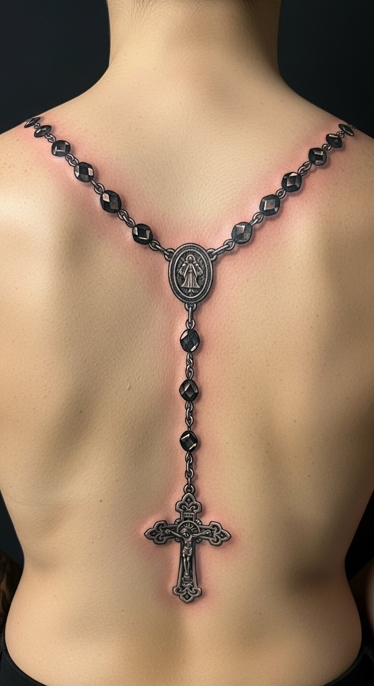 The rosary’s curve follows the spine and shoulder blades to enhance natural lines, giving the wearer a sense of empowerment and continuity; the cruciform pendant or centerpiece can rest near the lower neck or between the shoulder blades as a focal point.