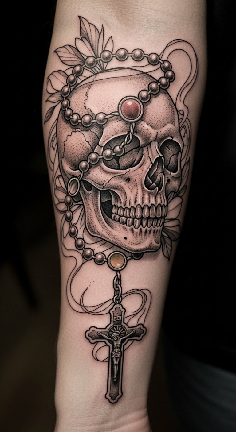 Rosary Tattoo With a Skull for Life and Death Symbolism