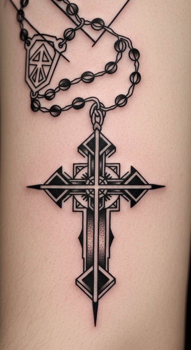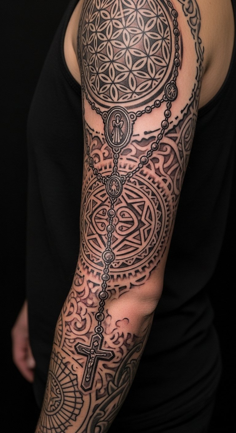 When placed along the forearm or centered on the upper back, this tattoo weaves the circular geometry of mandalas into the looped rhythm of a rosary. The beads form arcs that guide the eye toward a radiant central mandala, while a small crucifix or medallion anchors the design.