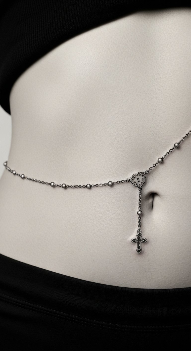 As you adorn your stomach with a delicate rosary chain tattoo, each bead and pendant tells a story of faith that intertwines with your very essence.