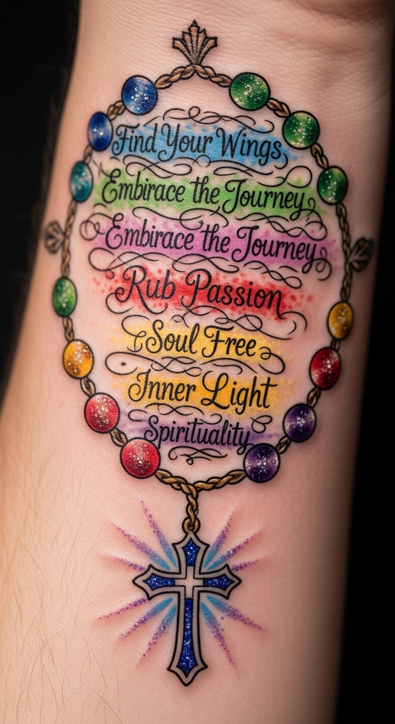This design weaves bright, jewel-toned beads forming a rosary that circles the wrist like a bracelet, with delicate script quotes threaded between beads; symbolize personal milestones and values through varied bead colors and small icons (flowers, stars, tiny wings) embedded in select beads.