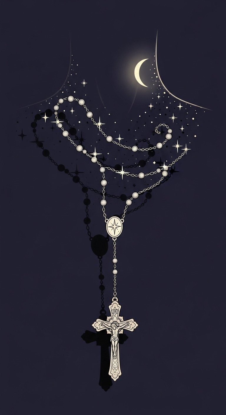 The rosary symbolism intertwines beautifully with celestial guidance, reminding you that you’re never alone. Each star represents hope and direction, illuminating your path toward freedom and empowerment, encouraging you to embrace your true self and follow your heart.