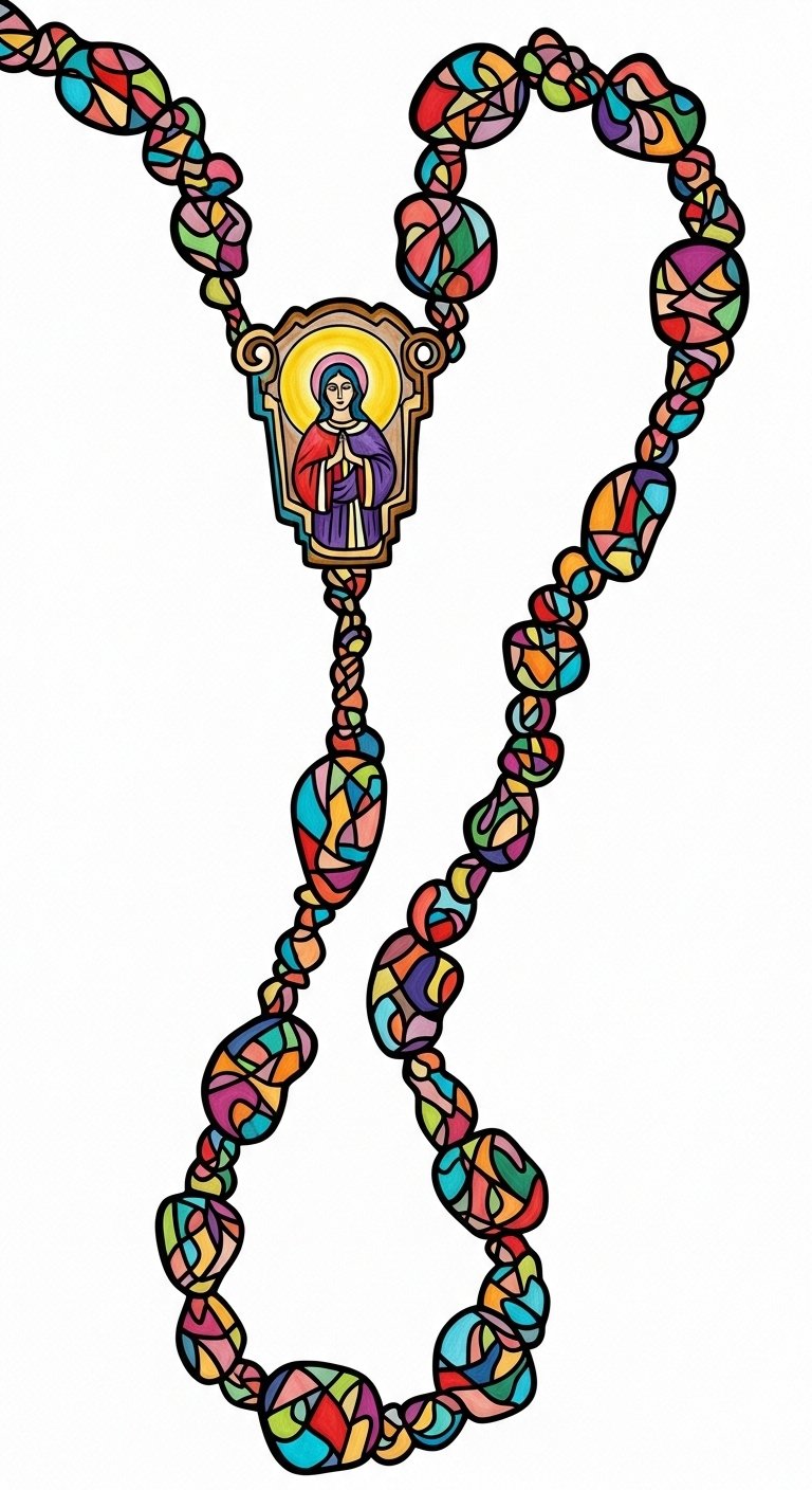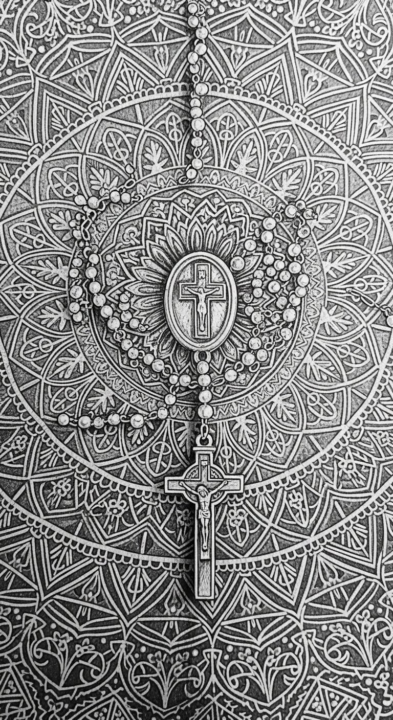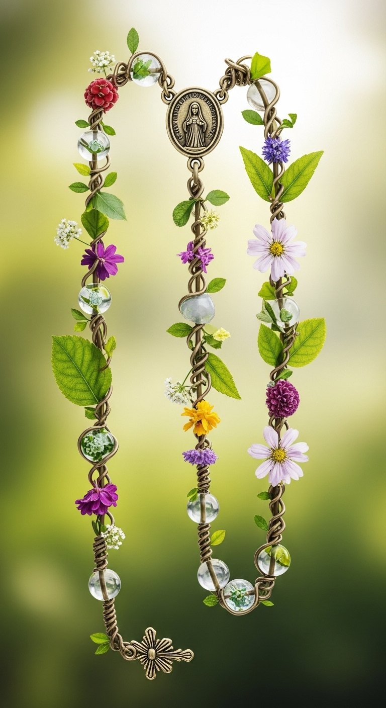 Symbolically, the rosary represents prayer, protection, and devotion, while the flowers bring themes of life, renewal, and connection to nature; together they express faith lived beautifully and personally.
