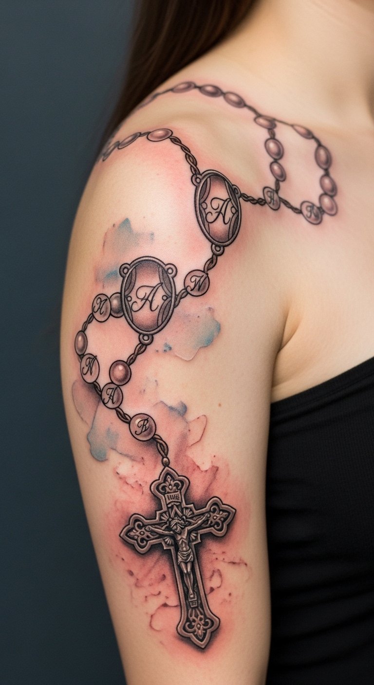 Incorporating personal initials into a rosary tattoo not only adds a unique touch but also deepens the connection to your faith. Imagine intertwining your initials with meaningful symbols, creating personalized designs that resonate with your spirit. Each bead and cross becomes a reflection of your journey, a demonstration of your beliefs, and a symbol of empowerment, celebrating who you’re in your quest for freedom.