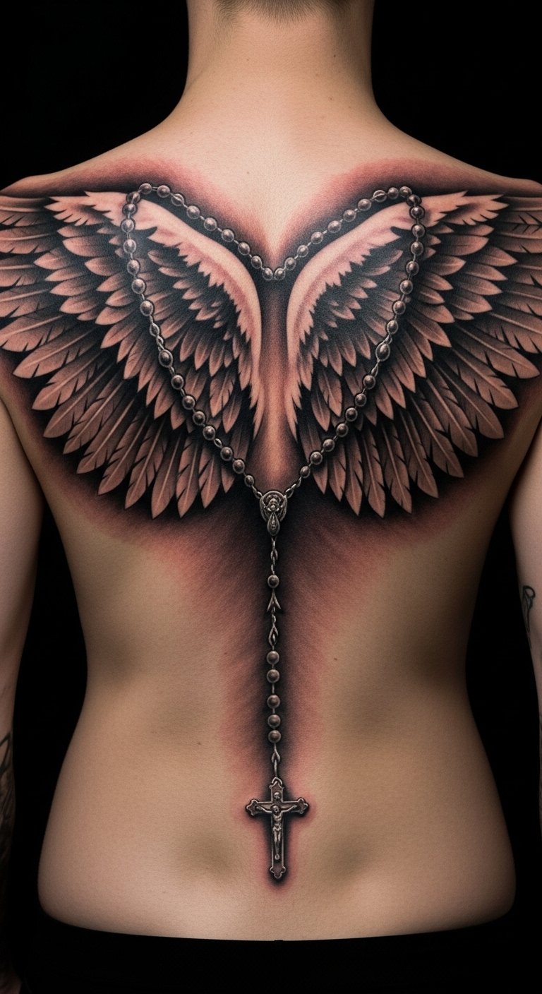 Embrace your faith boldly, letting your body tell a story of strength and grace. The imagery conveys protection, devotion, and transcendence—wings for shelter and upward movement, the rosary as faith and continuity—evoking calm confidence and reverence; ideal centered along the spine with wings spanning shoulder blades for a balanced, visible statement that moves with the body.