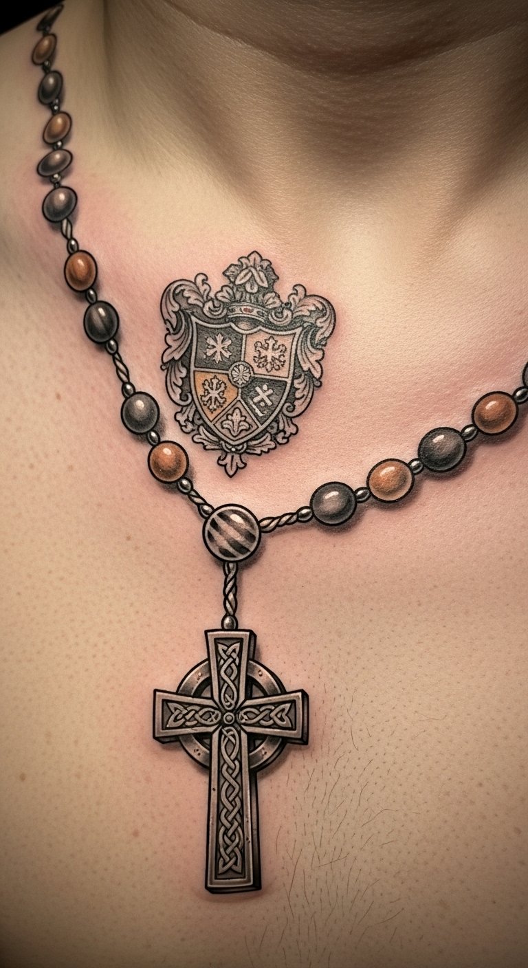 Embracing your heritage through a rosary tattoo adorned with your family crest creates a profound connection to your roots. This unique design embodies heritage symbolism, celebrating your lineage with every bead.