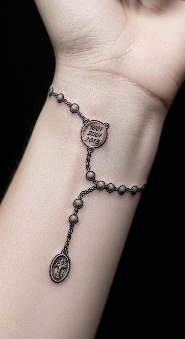 Place the tattoo on the inner wrist or along the forearm so the engraved date sits where you can often see it, evoking reflection, connection, and quiet strength; the small scale keeps it intimate and personal, while the rosary’s circular flow symbolizes continuity and faith.