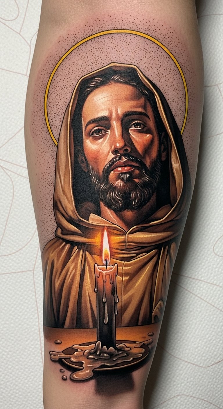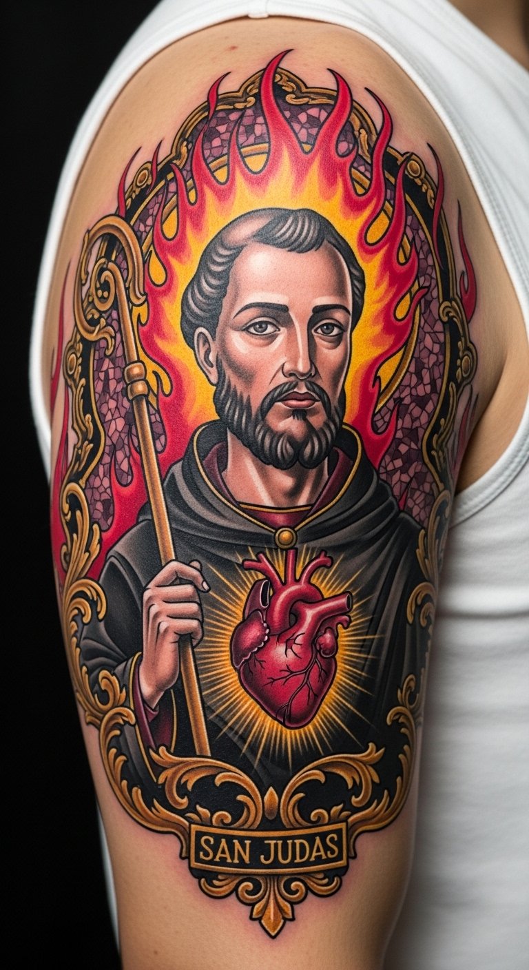The flickering light represents resilience, guiding you toward freedom. By including candlelight in your tattoo, you celebrate the strength San Judas embodies, inspiring you daily with warmth and faith.