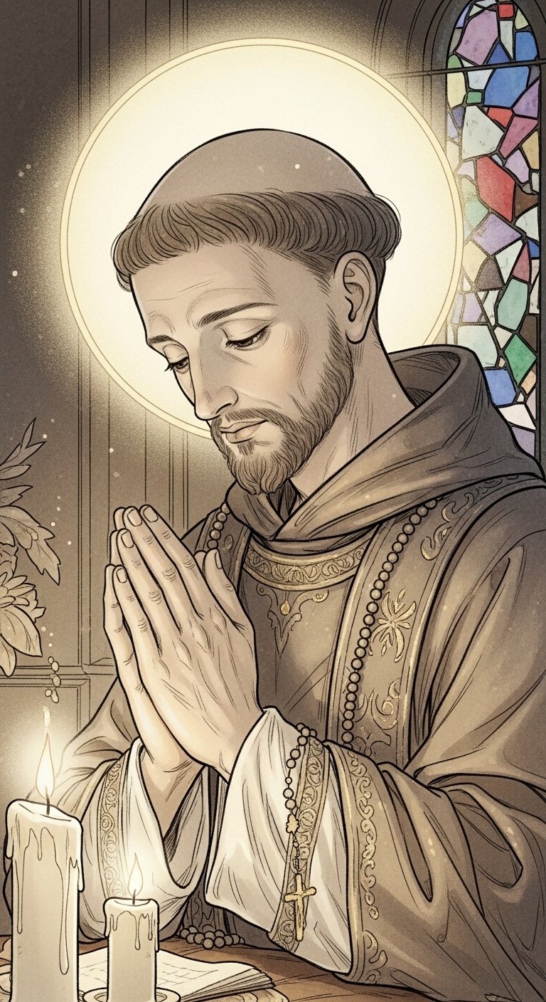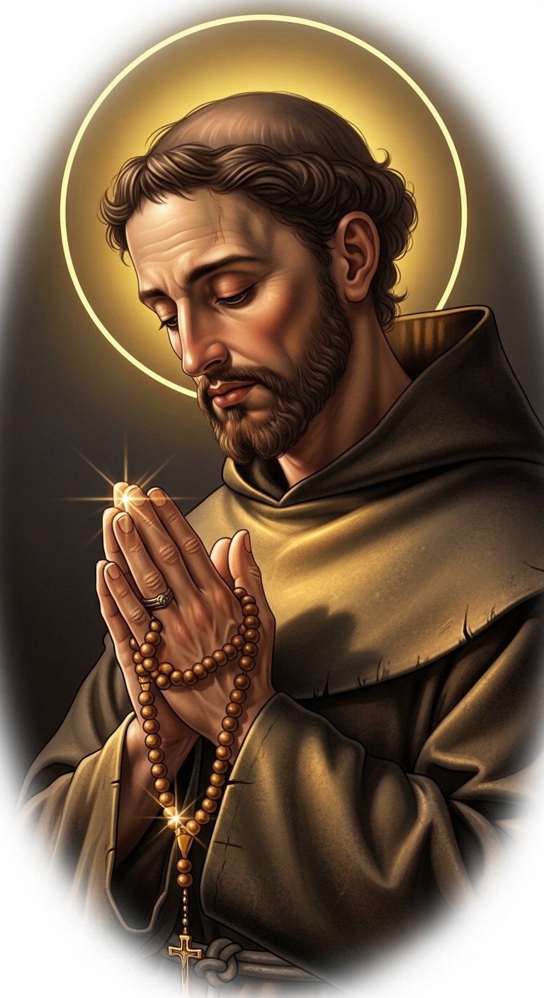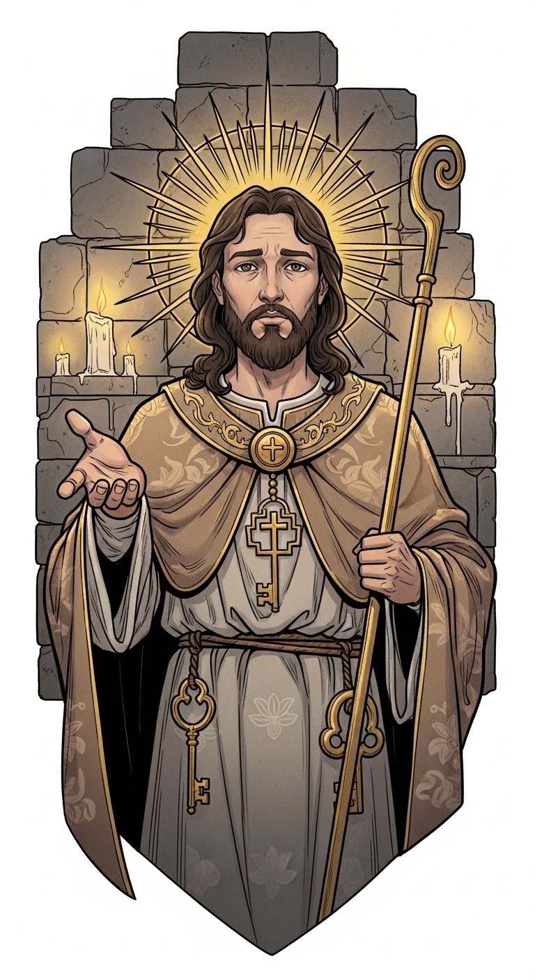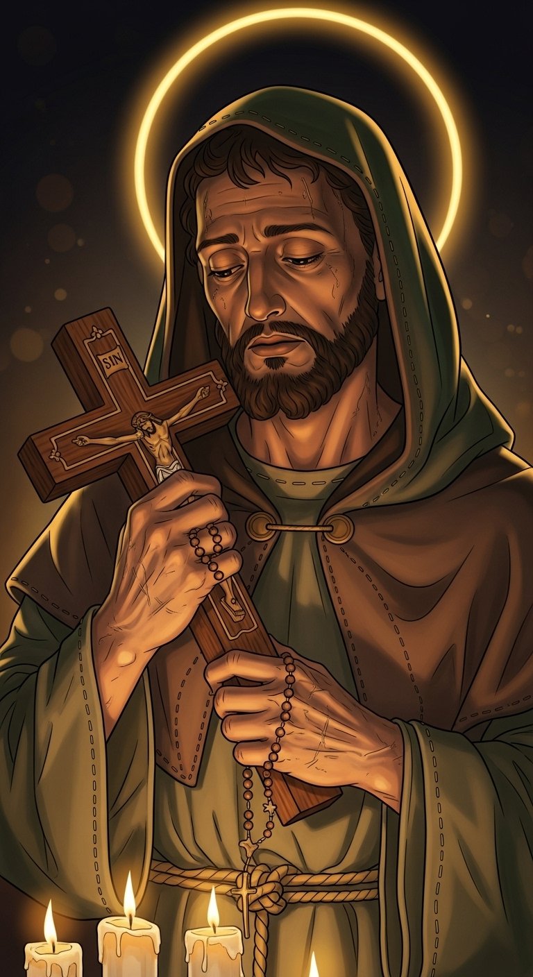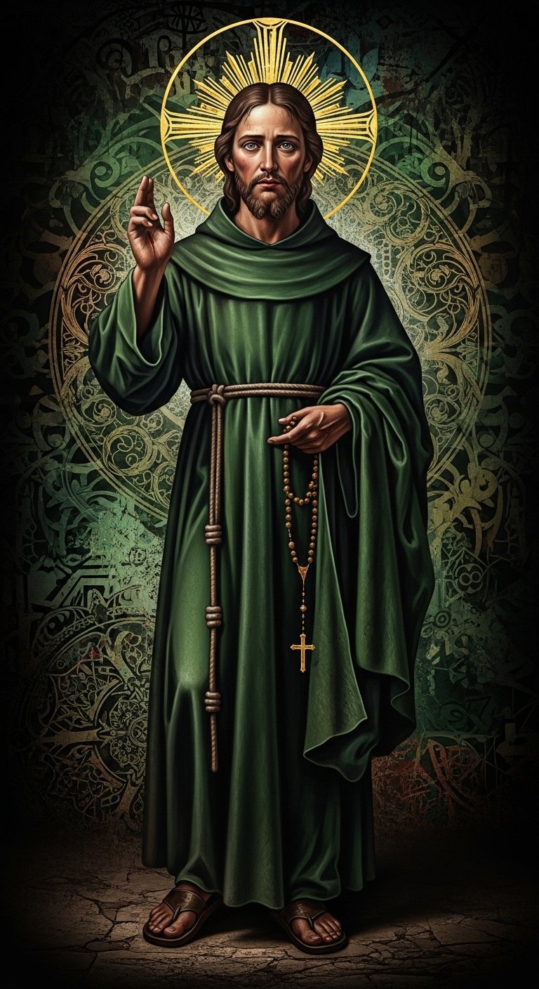 The design combines devotional realism and tattoo-flash clarity to evoke reverence and comfort; the warm candlelight and halo emphasize protection and divine presence, the weathered hands and stitched cloak speak to endurance and solidarity with the suffering, and the rosary and ornate cross reinforce spiritual intercession.