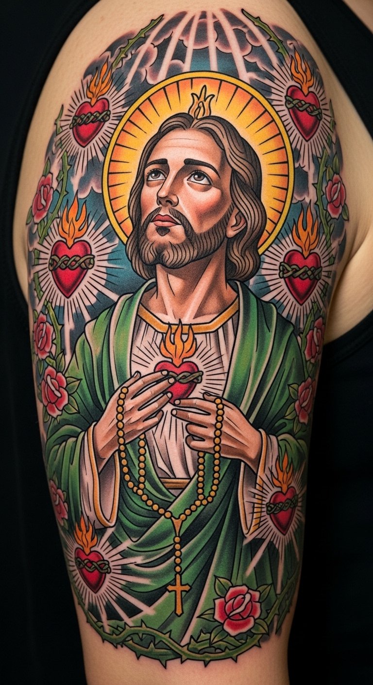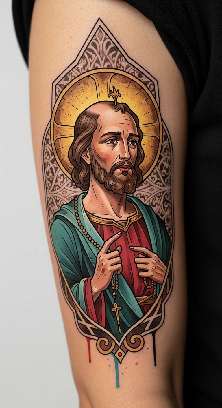 This placement on the upper arm allows the portrait to flow with muscle contours, the halo curving toward the shoulder for visibility; symbolism emphasizes renewal (green), devotion (red), and safeguarding (blue), evoking steadfast courage and tender faith while the weathered details suggest a lived, protective presence.