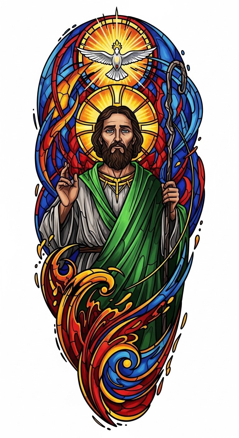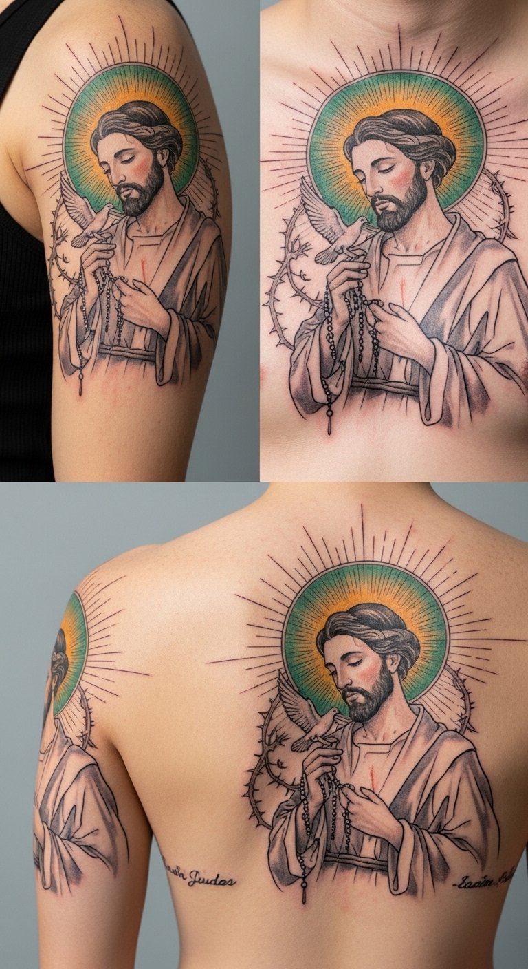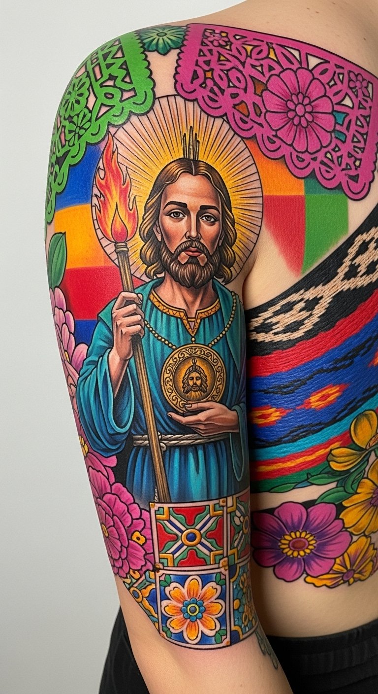 When designing this tattoo, emphasize classic iconography—San Judas’ halo, green robe, and floral motifs—in saturated jewel tones with fine-line shading to evoke reverence and living tradition. Place the bold chest piece centered over the sternum to read as a protective emblem, or reduce scale and simplify details for a wrist or forearm variant to serve as a discreet talisman. Symbolically, the vibrant palette and traditional elements communicate hope and protection, while the careful placement and stroke work connect the wearer to community, resilience, and a lineage of strength and freedom.