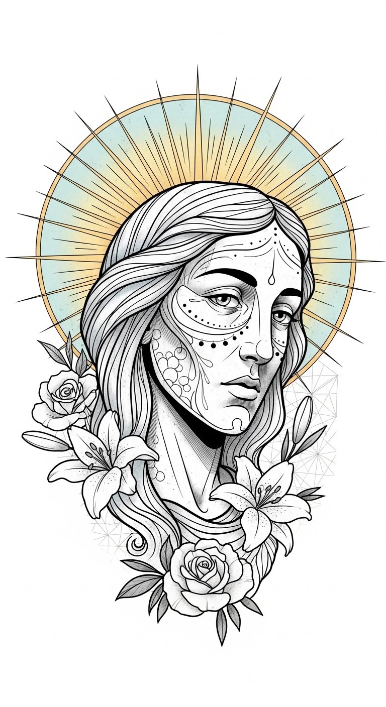 You’ll feel a connection to hope and strength, inspiring you to embrace life’s challenges with unwavering faith. The composition draws the eye to the halo as a source of light and comfort, the floral elements soften the portrait and symbolize renewal, and the geometric background grounds the piece—ideal for a forearm, chest, or upper back where the halo can align with natural contours to convey protection and visible devotion.