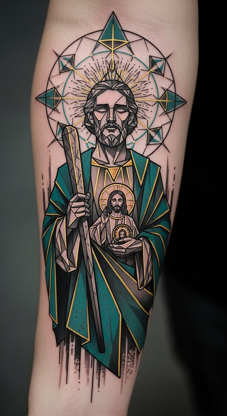 Blending the spiritual essence of San Judas with geometric patterns offers a fresh, modern take on this revered figure.