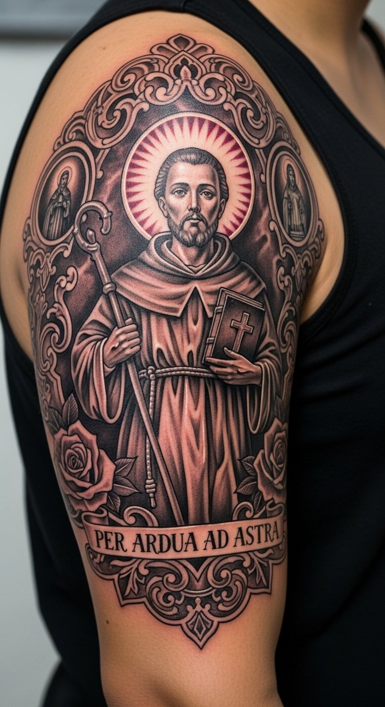 Ideal placements are the upper arm for visibility and strength, the chest for personal devotion over the heart, or the back for a larger, contemplative piece.