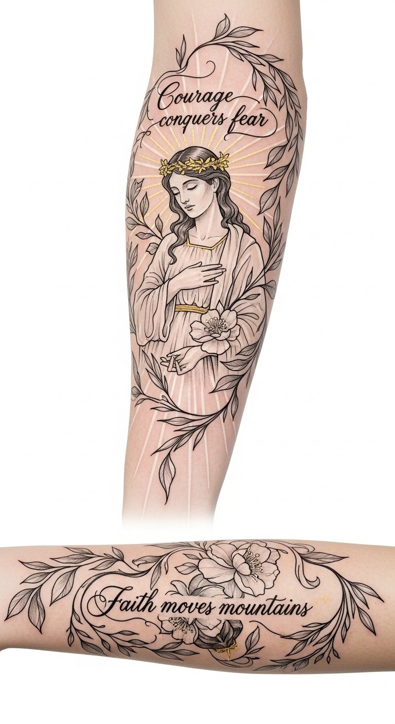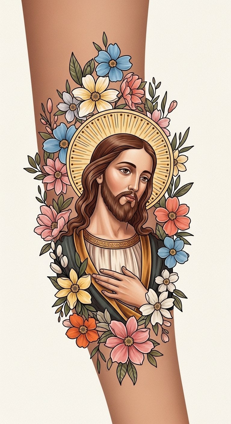 Placement over the forearm allows visibility and daily affirmation, while a centered chest piece gives a more private, heart-centered devotion; scale can be adjusted so the halo and floral frame wrap naturally with the body’s curves.