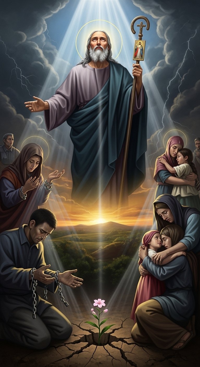 The symbolism centers on protection and perseverance—the saint as a steadfast core surrounded by flowers that each add meanings like renewal, courage, and consolation; emotionally it offers comfort and quiet confidence.