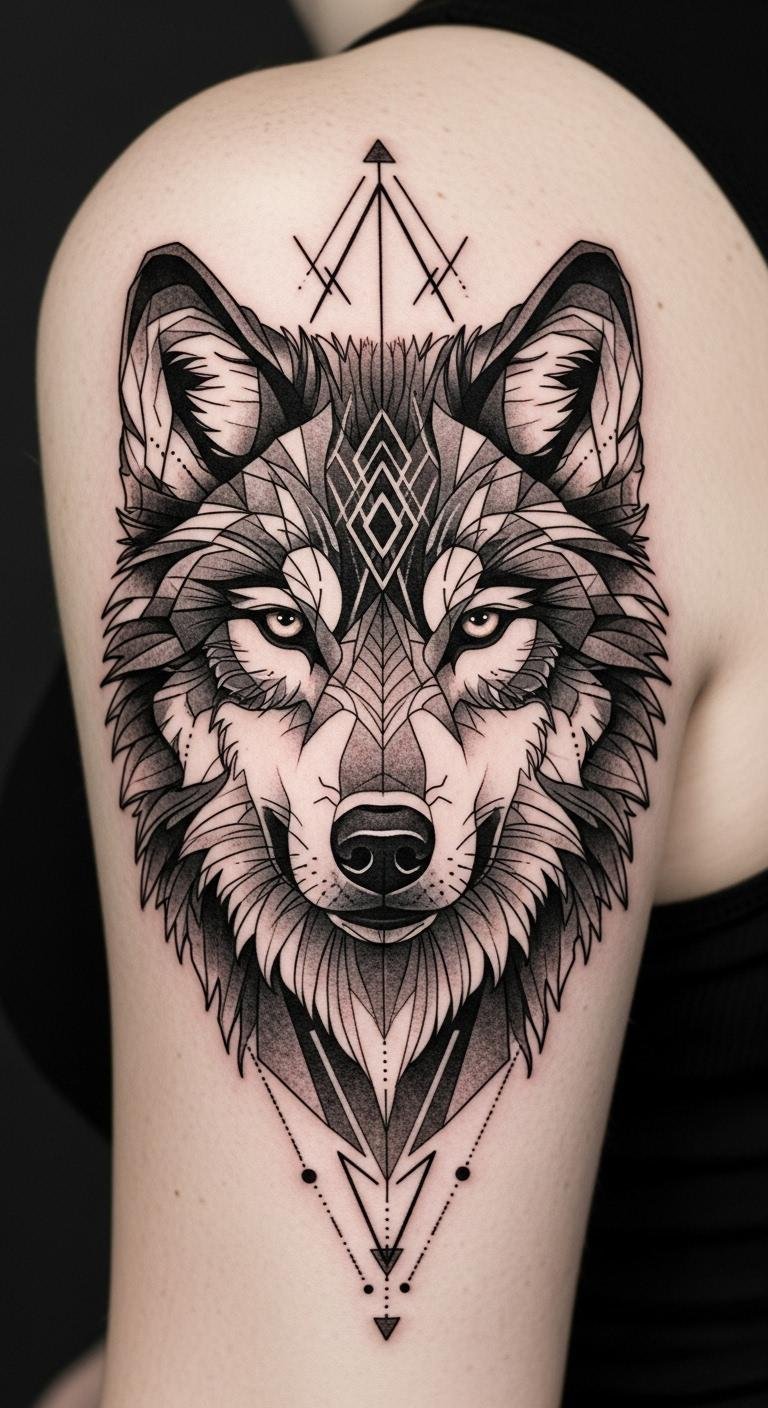 The geometric wolf head symbolizes inner resilience and the bond to pack or community; its sharp lines evoke focus and determination while softer negative space can suggest vulnerability balanced by strength.