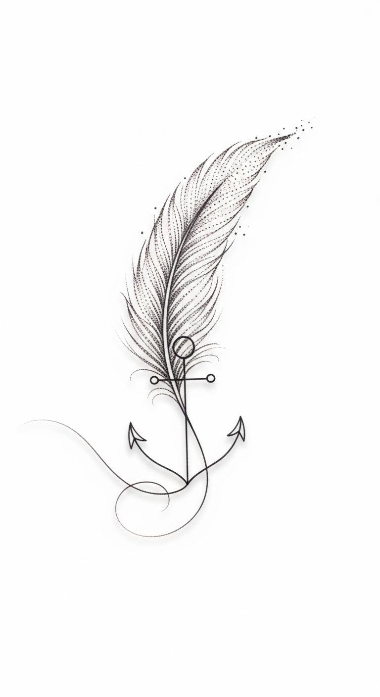 Flowing from the delicate beauty of a dotwork feather, the minimalist anchor tattoo stands as a symbol of stability and grounding.