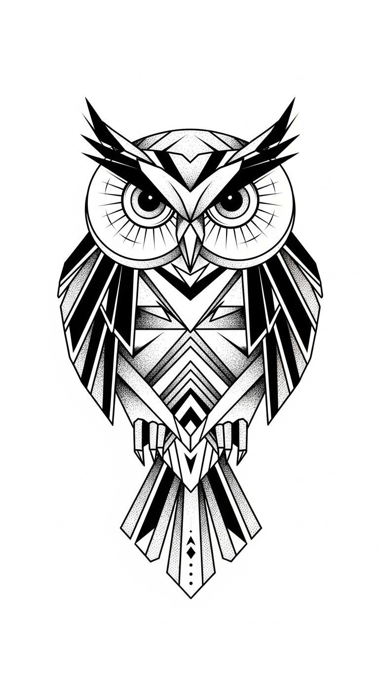 The striking geometric owl tattoo blends intricate design with symbolic depth, capturing the essence of wisdom and intuition.
