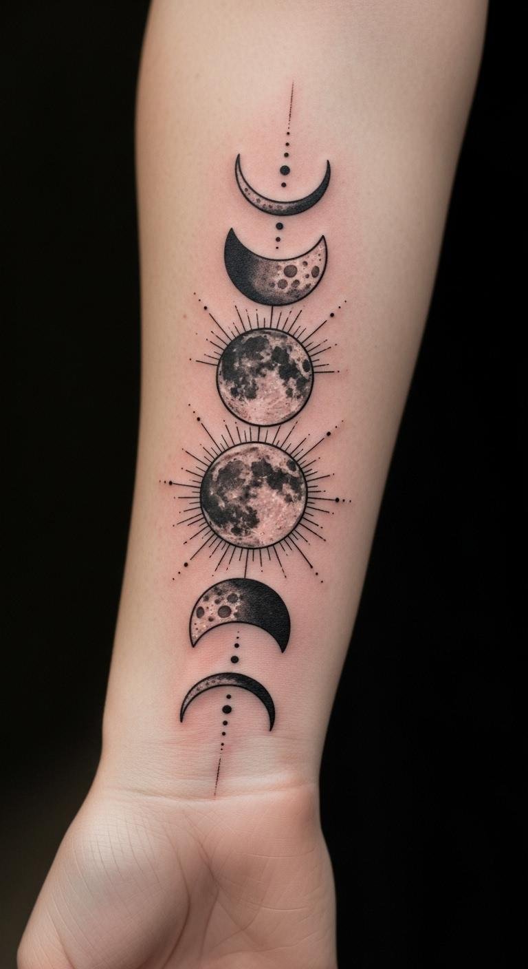 The imagery evokes quiet introspection and steady transformation—small crescents for new beginnings, a luminous full moon for culmination, and waning shapes for release; fine line work and subtle dot shading can convey delicacy and continuity, while spacing along the forearm or around the wrist creates a rhythmic, wearable narrative of time and resilience.